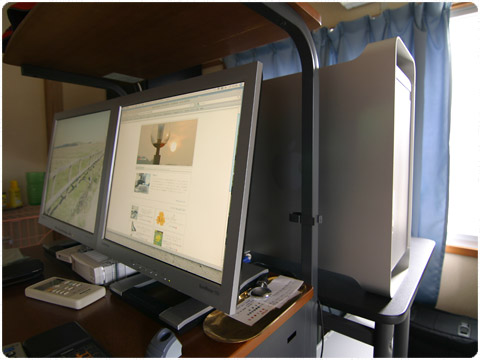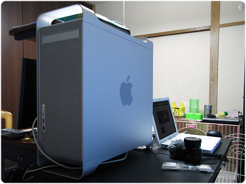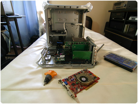 PowerMacG4です。その手前の赤いパーツは以前オークションで買った128MBのグラフィックアクセラレーターカード、PC用を改造したものです。普通にモニター表示を見ている分にはいいのですが、Photoshopのフィルター処理確認などの細かい作業では問題あり。そこで以前の64MBのカードに戻しました。さて、取り外したカード、売る訳にもいきません。