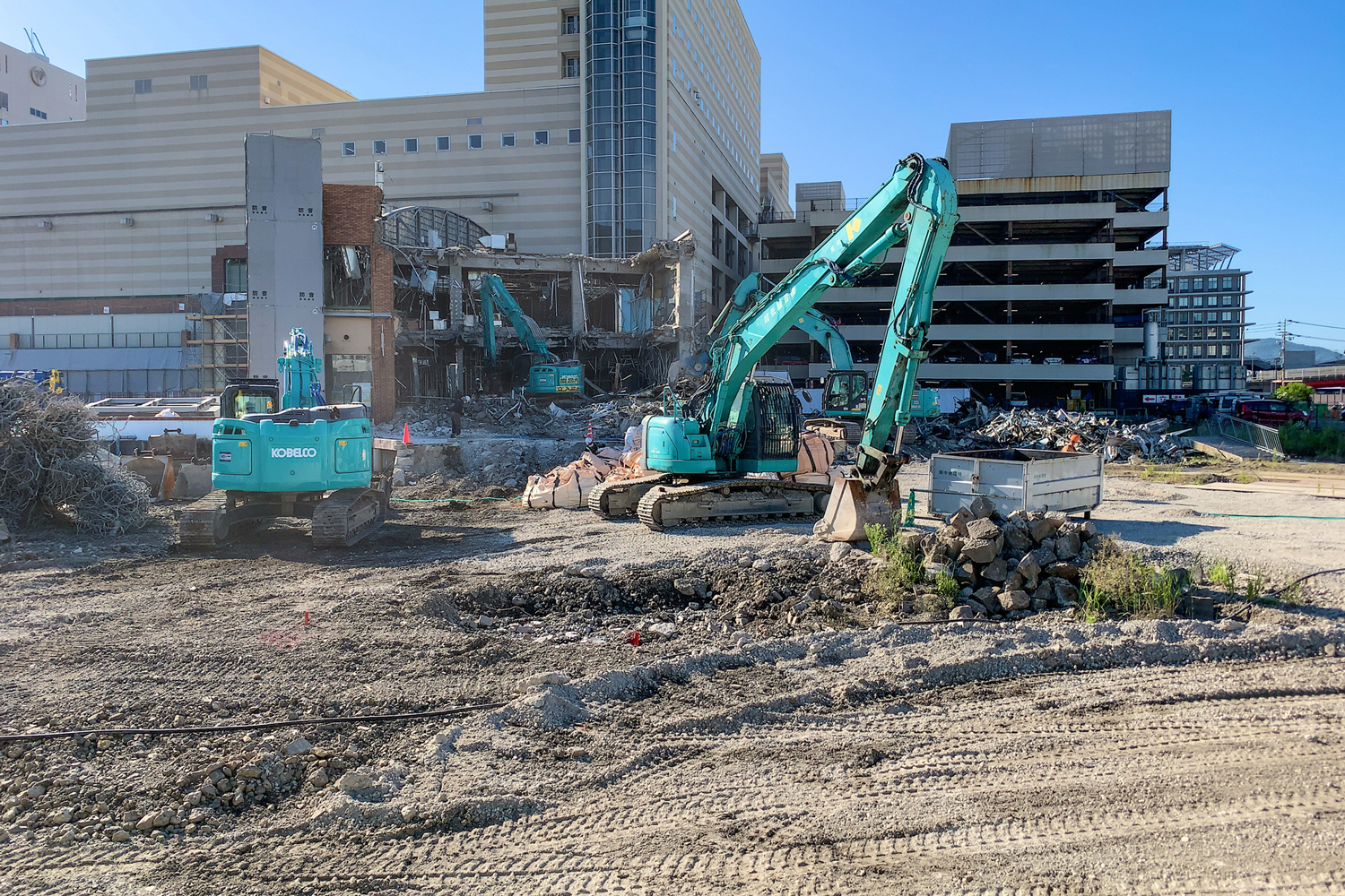 画像は、長崎駅の新駅ビル新築工事の様子ですが、瓦礫と化した旧駅ビルやホーム等のコンクリートの塊を更に細かく砕く重機や複数のショベルカー、杭打ちの大きな重機等、10台以上の重機が朝からうごめいてますが、帰宅時の17時以降には休息しています。
