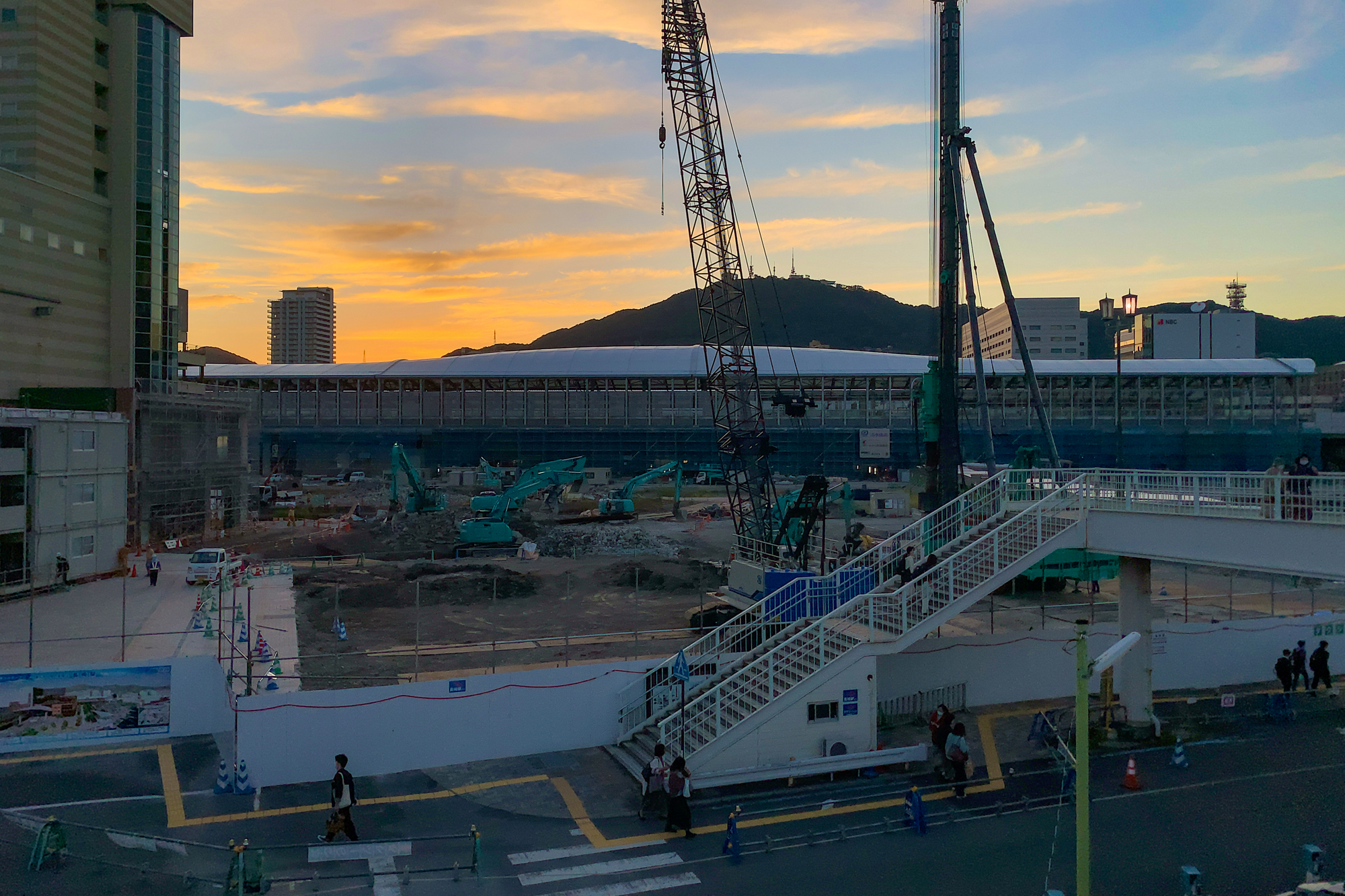 西口の施設、「出島メッセ」と「ヒルトン長崎」は、いよいよ来月にオープンしますが、東口はこれからといったところです。当初は2025年度完成予定の新駅ビルでしたが、建物内に組み込む予定の駐車場(約1,300台)を見直し、工期を短縮して2023年秋開業予定に前倒しされました。現在の「アミュプラザ」や「JR九州ホテル」がある駅ビルはそのままに、増設されるようなかたちで新駅ビルが建設されます。1F〜4F(1部5F)には、商業施設、5F〜6Fはオフィスフロア、7F〜13Fには、JR九州グループとしては初めてとなるインターナショナルブランドのホテル「マリオット・ホテル」(客室約200室)が進出予定です。