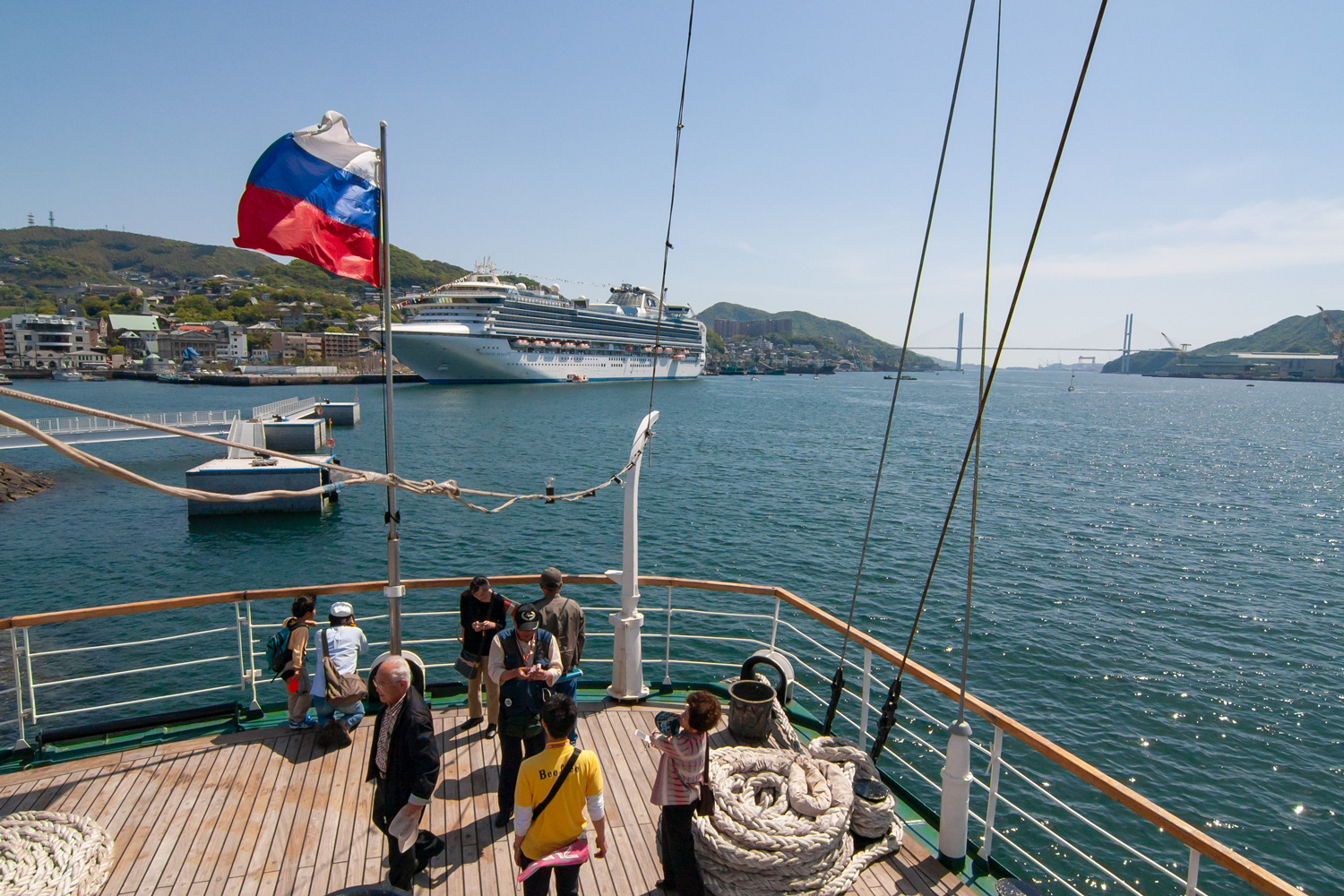 GW初日、「日本丸」のセイルドリル(帆を張る訓練)に時間を合わせて出かけた「2012 長崎帆船まつり」です。参加していたロシアの大型帆船PALLADA(パラダ)の船内見学に加わり、デッキから撮影しました。松が枝国際ターミナル埠頭に停泊しているのは「ダイヤモンド・プリンセス」です。