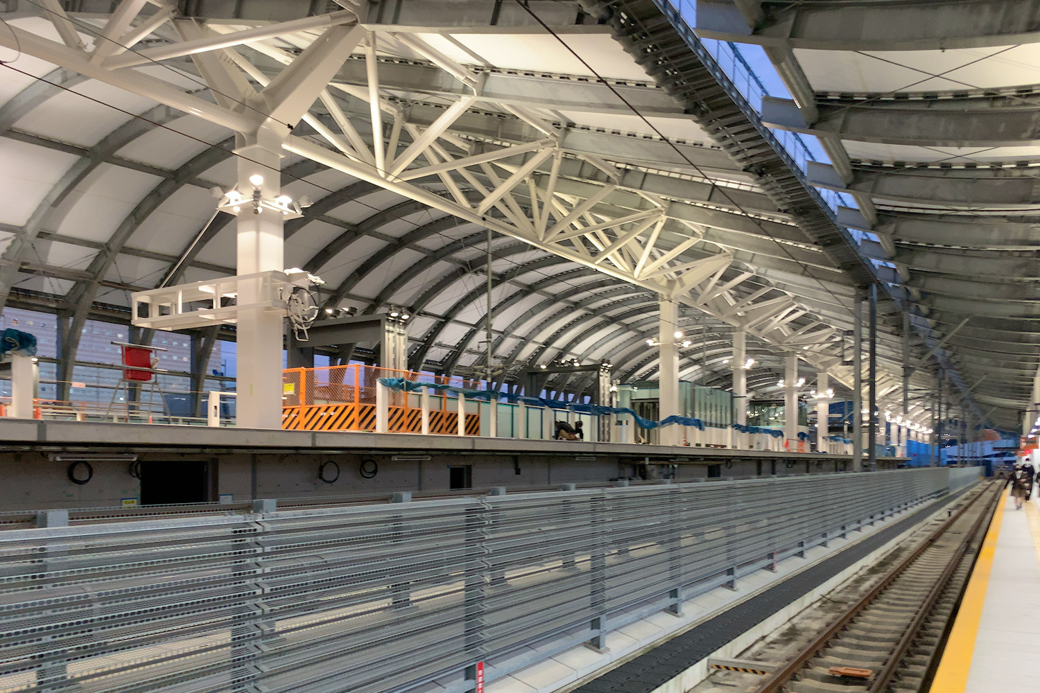 情報はあらかじめ得ていましたが、照明は屋根の方に向けられています。白いシート状の屋根に反射してホームを柔らかく照らすという間接照明になっているようです。