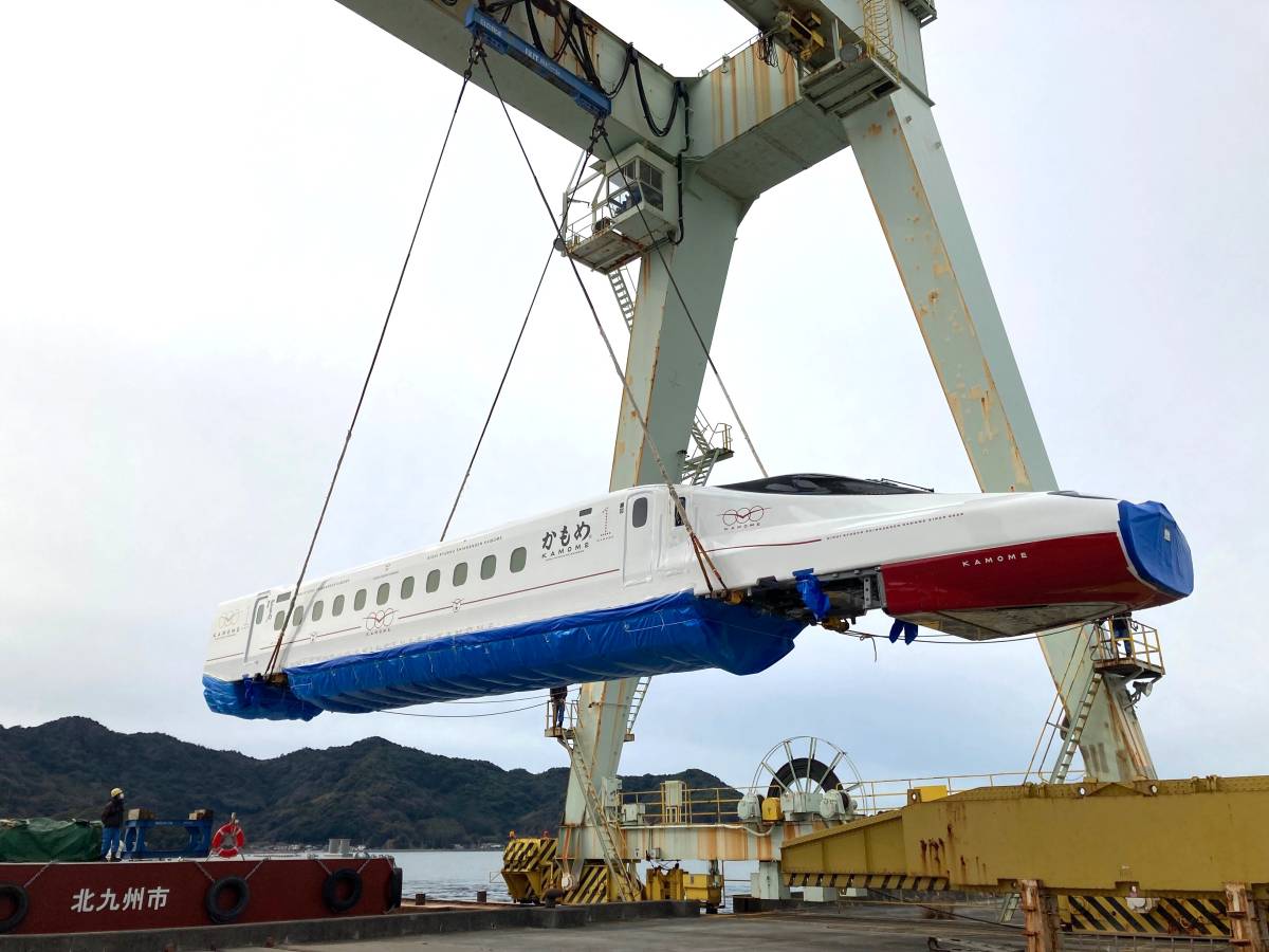 先ずは専用の船舶で海上輸送をし、長崎県内の港から陸路で車両基地へと運び込まれるようです。いよいよ近いうちに試験走行も行われるんでしょうね。