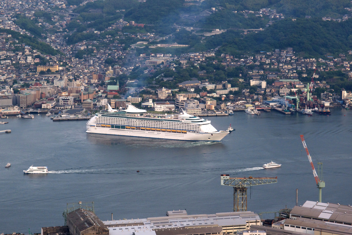 画像の手前右側中央寄りのクレーンも三菱長崎造船所関連施設の「ジャイアント・カンチレバークレーン」という今回の構成資産のひとつです。