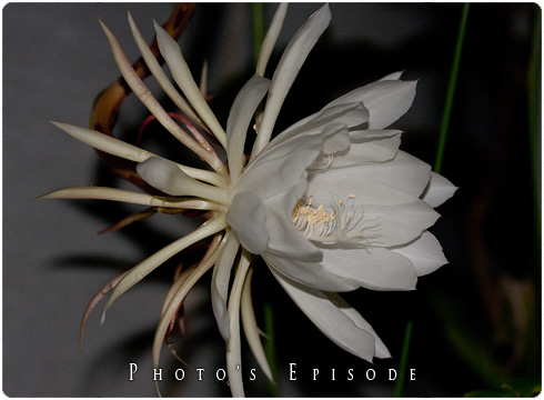 花が咲くまで・・・⑤ 開花して約2時間が経過した22:50頃の花の様子です。2つだけ咲いた花にしてはしっかりと周囲に甘い香りを漂わせています。原産地メキシコの熱帯雨林地域では、この甘い香りに誘われて花粉の運び役であるコウモリがやって来る訳ですね。『自家不和合性』(自分の花粉を自分の株のめしべが受粉しても受精に至らない)の植物にとっては、昆虫よりも移動距離の大きなコウモリでないと花粉の運び役に適さないという事のようです。 2011-09-08 10:01