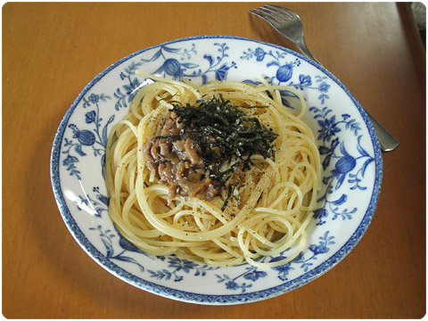 近頃の昼食事情 いくら麺類が大好きとはいえ、こう蒸し暑くなった近頃は、スープものは敬遠気味になってしまいます。この季節、ほぼ完全に作らないのはラーメンです。その代わりパスタが増えました。なんせ茹でるだけで、ソースについては相当に沢山のレトルトがあります。しかも安い。アルデンテがどうのこうのと言ってた頃もありましたが、簡単に作れて結構旨いのです。画像は「きのこ醤油バターソース」です。 2009-06-18 10:46