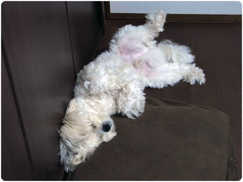 午前0時の寝姿 ほぼ毎日のように、午前0時頃を迎えると、仰向けになって寝ているマロン君です。 もうこの時間は、声をかけようが、少々触ろうが、一瞬目を開けてもまたすぐに眠ってしまいます。ただ、こちらもこの時間付近に寝てしまった方がいいようです。午前2時頃に部屋が明るいとすっかり目覚めてしまいます。こうなると大変で、ボールをくわえてやってきます。 2009-06-25 00:20