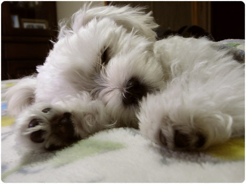 寝顔 昨日、今日と天気が良くありません。散歩に行けなかった日は、ストレスが溜まっているのか、夜に走り回ったりするマロン君(マルチーズ)です。小さな赤ちゃんだった頃からわずか2ヶ月間ですが、成長は著しく、体重は約2倍程になりました。明日はどうやらいい天気みたいなので出かけられそうです。 2009-03-09 12:39