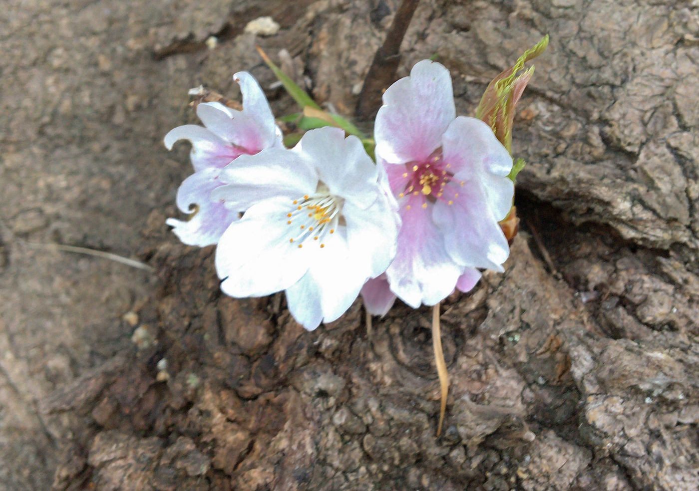 画像は、古木の根?かなと思われる、地表に現れている一部に伸びかけている小さな枝に咲いているソメイヨシノです。
